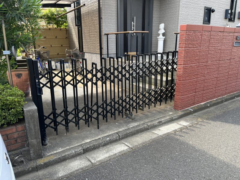 新しく取り付けた伸縮門扉は、アルミ製で軽く、錆びにくく、開閉もスムーズ