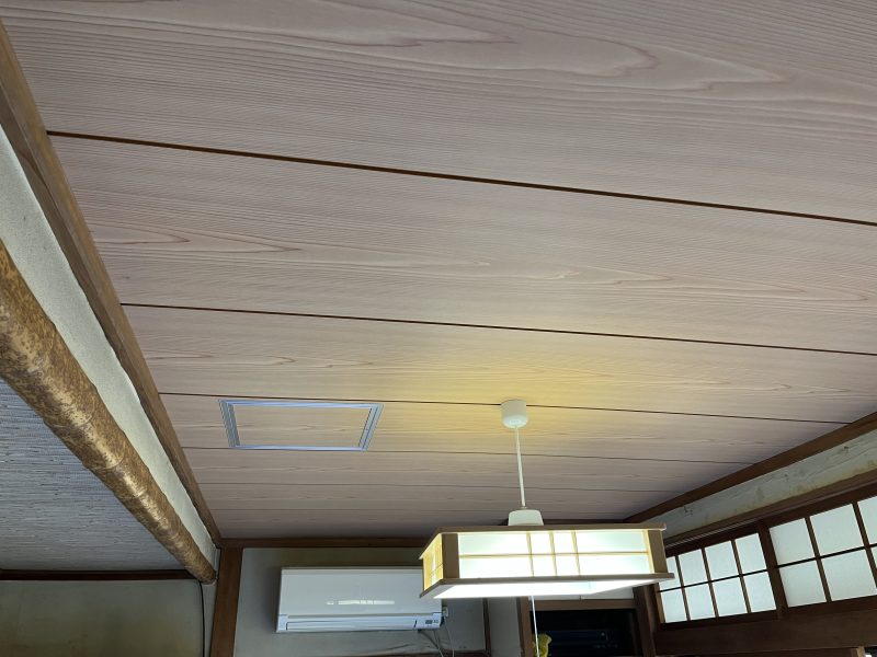 リフォーム後:新しい木目の天井板が張られ、和風の照明や点検口が設置されています。