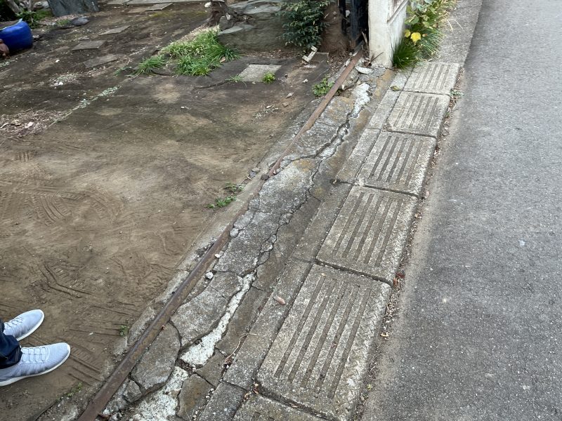 駐車場とお道路の境界部分には、かつて引き戸式の門扉があったのでしょうか、古い鉄製のレールが残っていました。経年劣化により周囲のコンクリートが割れ、レールが浮き上がってしまっている状態です。