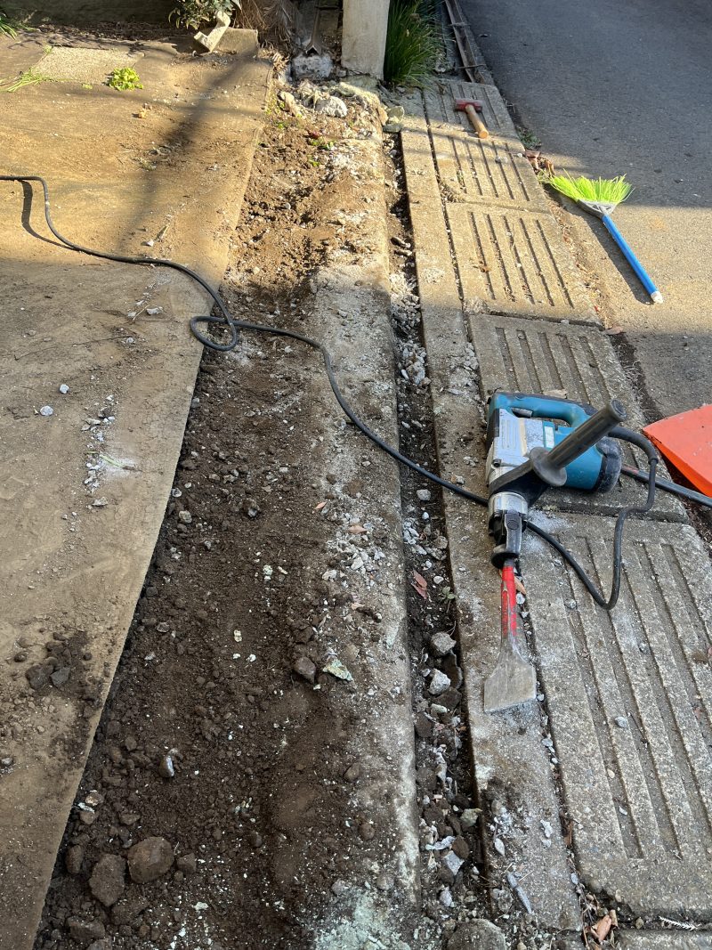 まずは、車を傷つける原因となっていた鉄製のレールを撤去します。 写真にある通り、電動のピック(ハンマー)を使用して、盛り上がっている箇所のコンクリートを砕いていきます。これを「はつり作業」と呼びます。
