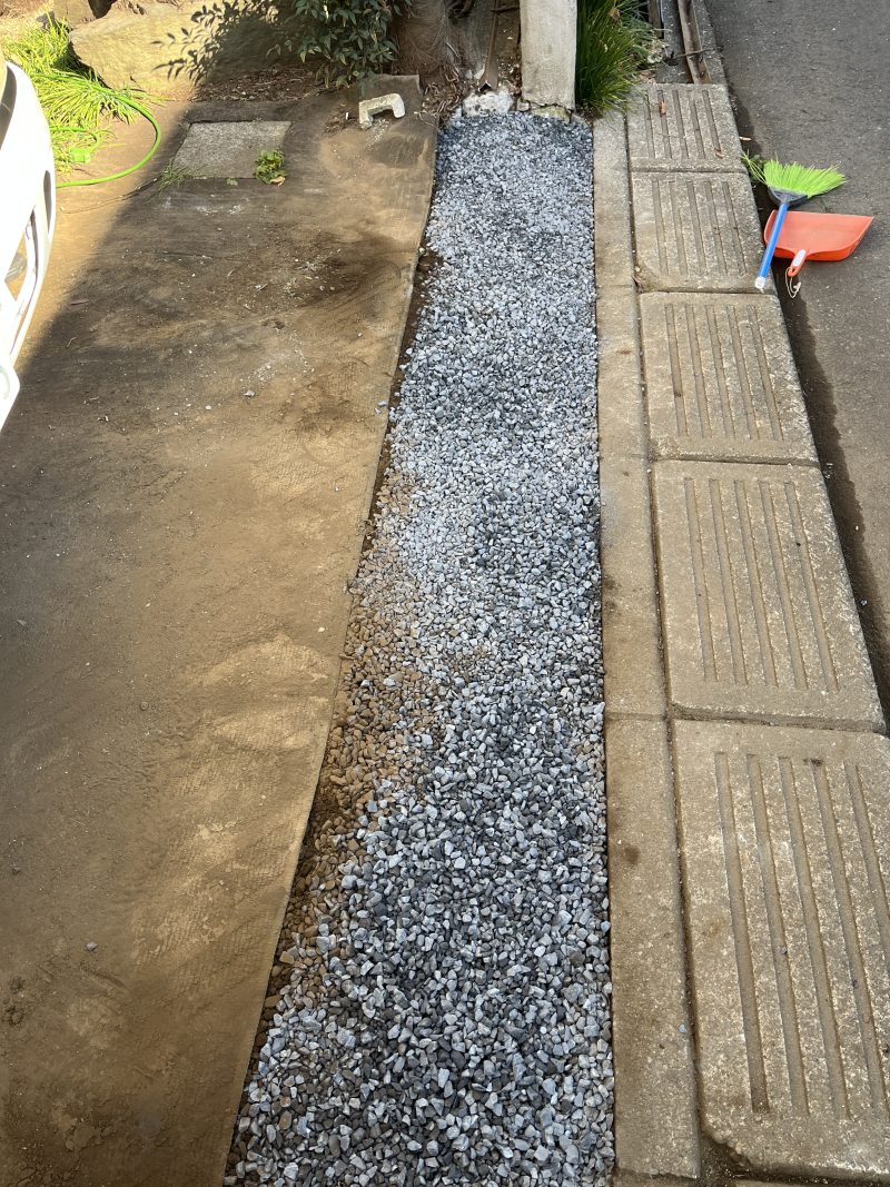 仕上げに砂利を敷き詰めます。使用したのは、踏み固めることで締まりが良くなる砕石です。 写真(3枚目)のように、周囲のコンクリートや既存のブロックと高さを合わせ、フラットな状態に仕上げます。